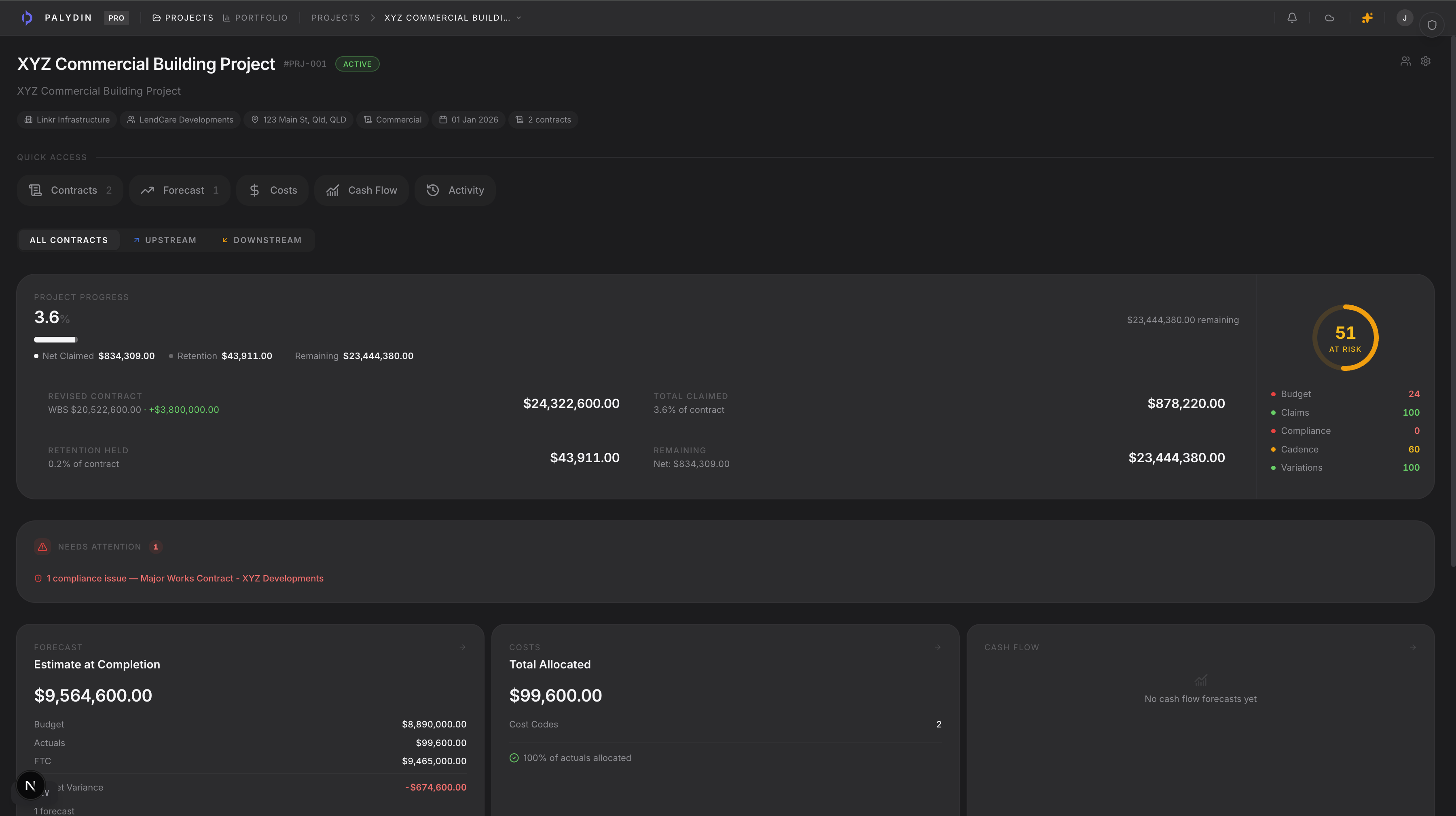 Track contract progress, health scores, forecasts, costs, and compliance status — all from a single project view that updates in real-time.
