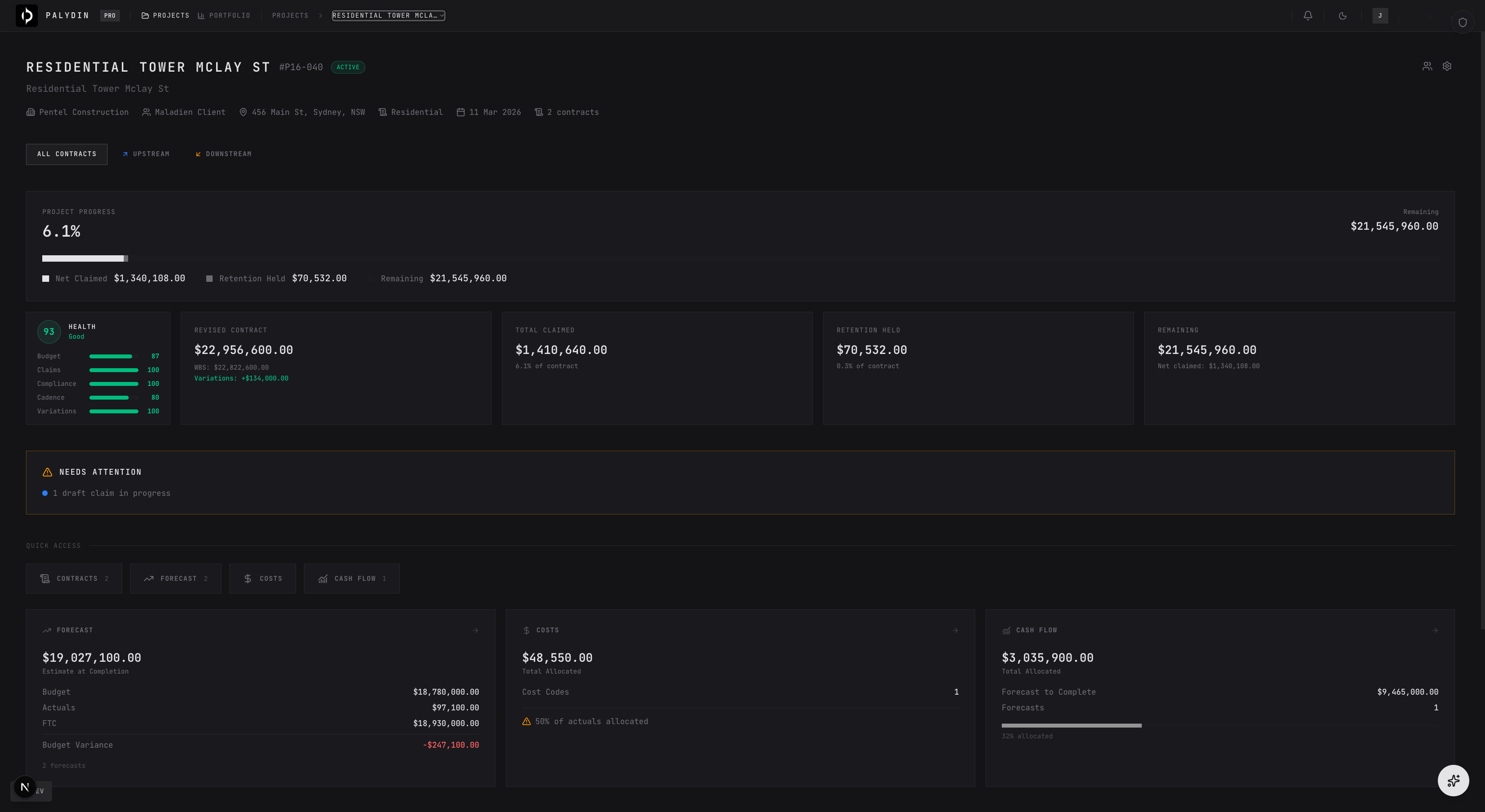 WBS, claims, variations, forecasts, retention, and compliance — in one structured data model. Not twelve spreadsheets.
